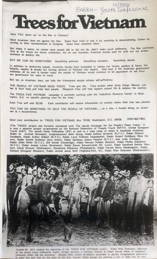 served prison sentences to maintain their pacifism. Jewish counterculturalists formed Trees for Vietnam to alleviate the deforestation of the land by American bombers. They met with North Vietnamese leadership and planted trees in ravaged forests, symbols of peace and renewal. The group’s organizers detested the American policy of “burning whole countrysides from the air, and forcibly moving whole towns into concentration camps,” atrocities that recalled German actions during World War II.