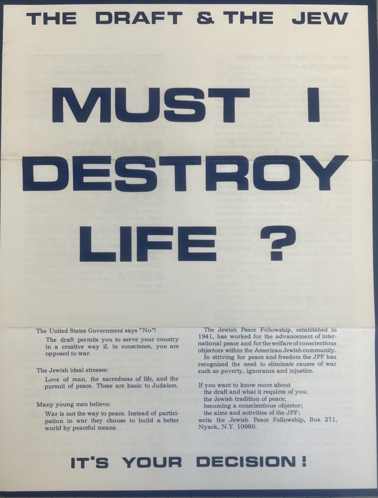Beyond tense exchanges inside and outside of Jewish communities, Jews organized powerfully in response to the war. The Jewish Peace Fellowship advised young Jews on how to obtain conscientious objector (CO) status. Draft counselor Murray Polner remarked that Jewish youths refused to march willingly “to southeast Asia to fight people who had never threatened them.” Many disaffected youths reconnected with Judaism and its teachings to prepare meaningful CO applications, and some who were rejected by their draft boards